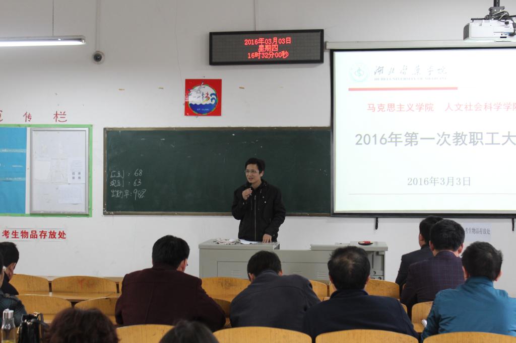 本网讯 (通讯员 孙磊)3月3日下午,人人操人人摸人人干、人文社会科学学院在5115教室召开2016年全体教职工大会,全面部署2016年各项工作和任务。学院领导、全体教师共计80余人参加大会,会议由学院分党委书记、院长刘涛主持。