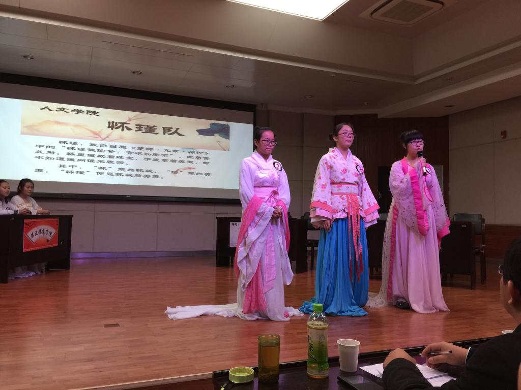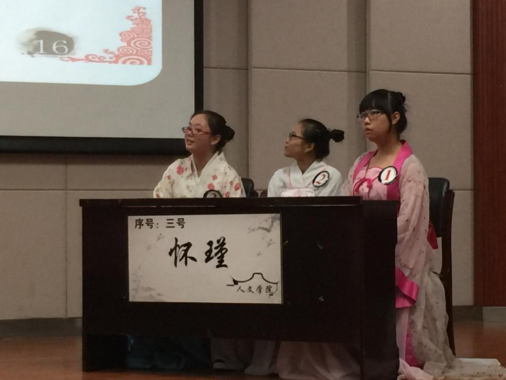 由人文学院16应用心理学丁焱红、瞿智慧、朱楠琴三人组成的“怀瑾”队在第一组出场,对战来自公管、第五临床、口腔的三支队伍,各环节精心备战,取得小组最高分。
