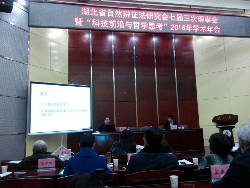会上,美国波士顿大学终身教授曹天予做了《学习和运用自然辩证法的几点体会——以最近参与有关大型对撞机的辩论为例》的主题报告。另有来自湖北省各高校的11位老师做了交流发言,内容涉及深空探测、水污染治理、量子纠缠、物理观察、病毒研究、高端智库、“绿蓝悖论”、绿色教育、怀特海过程哲学、马克思技术哲学、AlphaGo效应、机器人恐慌、自然主义、社会主义核心价值观、生殖系基因编辑技术、军事竞争等话题。