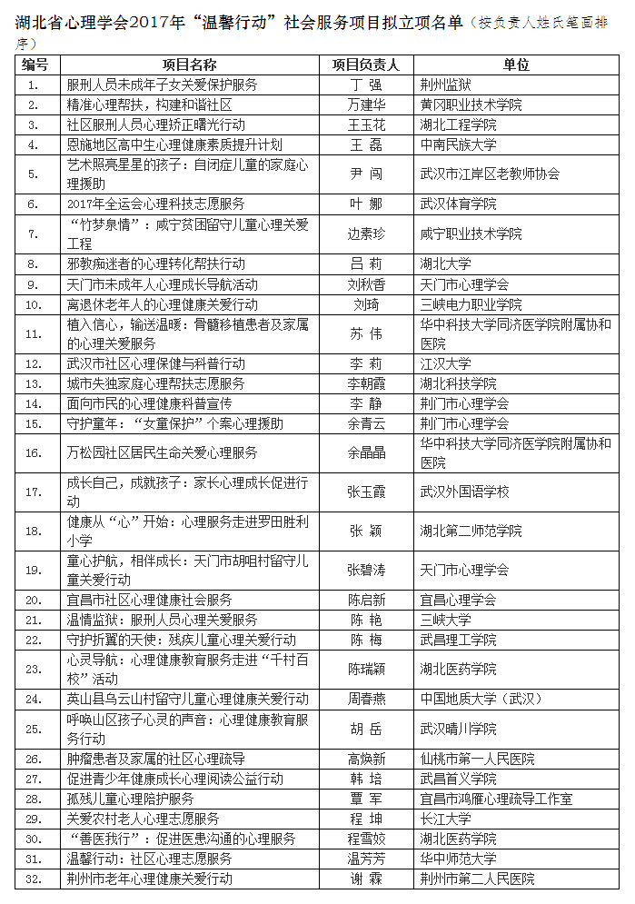 据悉,湖北省心理学会“温馨行动”社会服务项目为省级学会应用服务类科研项目。本次全省共申报了62项“温馨行动”社会服务项目,按照“体现公益、面向社会、立足行动、专业服务”的原则,专家通过评审,共有华中师范大学、中国地质大学等高校的32个项目获得立项。一所高校同时获批2个项目,仅湖北医药学院一家。