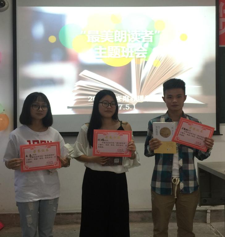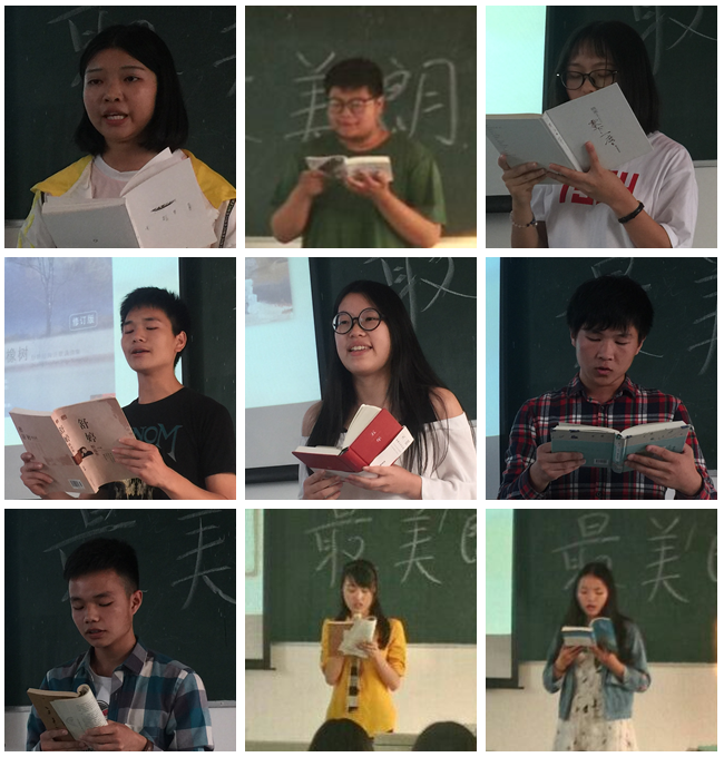 有十位同学报名参加了此次朗读活动,朗读作品包括英文经典《当你老了》、朦胧派诗歌《致橡树》、精美散文《其实你没有什么好怕的》、《被窝是青春的坟墓》、《尽心便是完美》、荒诞现实主义名篇《天的孩子》、说唱歌曲《刀山火海》等,配合优美的旋律,同学们被带入一个个自由畅想的海洋。最终,由全班同学担任的大众评审团选出了三名“最美朗读者”:凌意《我的南方和北方》、刘嫣《世界先爱了我,我不能不爱它》、兰家松《我的自画像》。