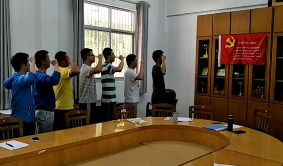 党员佩戴党徽,全体党员并按时如数缴纳了5月份党费,全体起立凑唱国歌,由万强老师带领全体党员重温入党誓词,王锋斌老师带领大家学习党章的总纲中国共产党的性质和思想行动指南等内容。