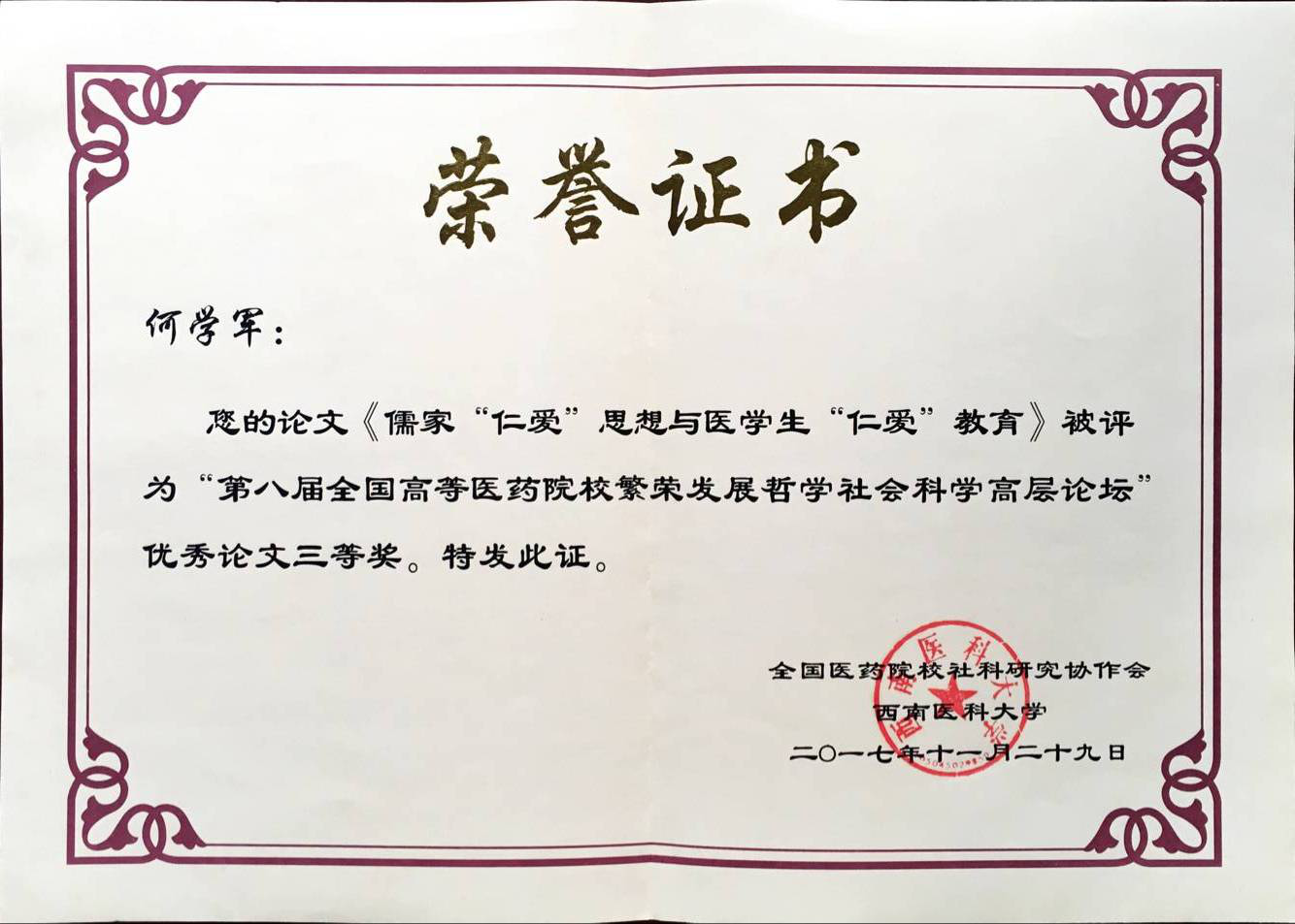 我校人人操人人摸人人干、人文社会科学学院教师陈全新老师、何学军老师应邀参加会议。以文参会,本次会议共收到论文73篇,专家采取盲审的方式进行核定评奖,最后,有23篇论文脱颖而出。我校何学军老师撰写的论文《儒家“仁爱”思想与医学生“仁爱”教育》获“第八届全国高等医药院校繁荣发展哲学社会科学高层论坛”优秀论文三等奖。
