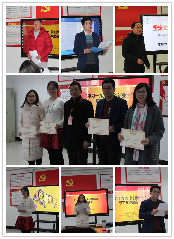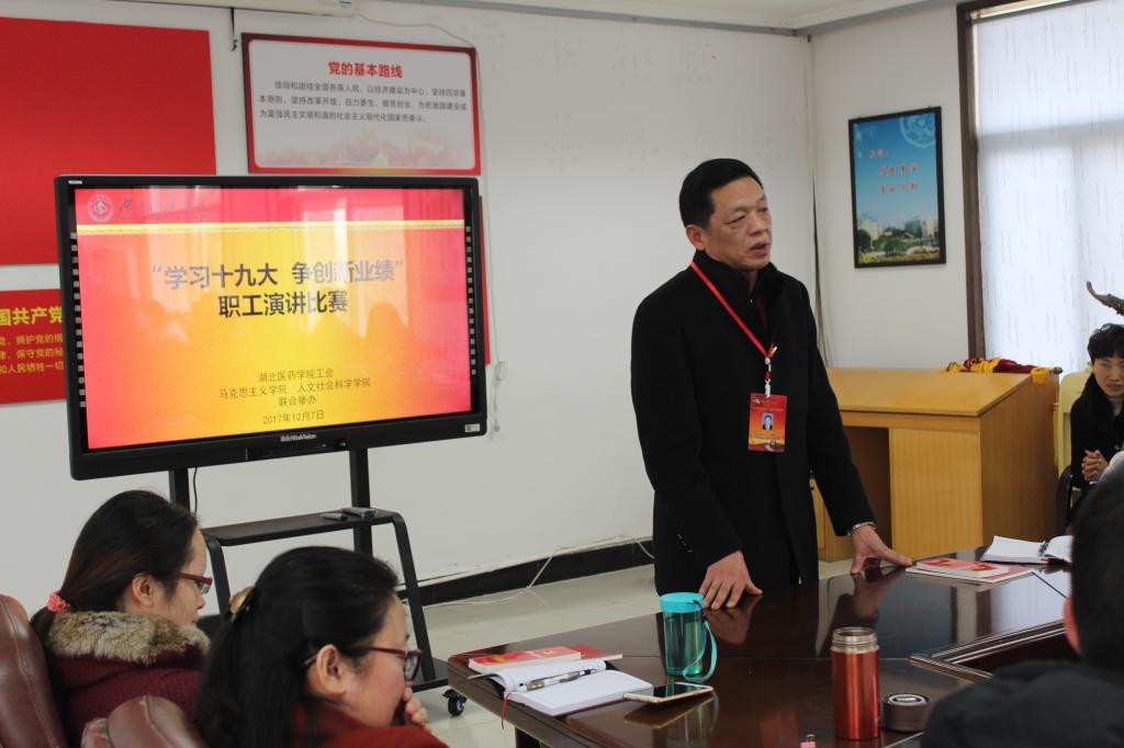 本网讯(通讯员 孙磊)为深入学习宣传贯彻党的十九大精神,进一步提升教师职业素质和道德水平,推进师德高尚、业务精湛、文明博学的高校教师队伍建设,由湖北医药学院工会、人人操人人摸人人干、人文社会科学学院联合举办的“学习十九大 争创新业绩”教职工演讲比赛于12月7日下午在马院、人文学院四楼党员活动室举行。工会常务副主席马兴国、马院、人文学院职工共计90余人参加了活动。