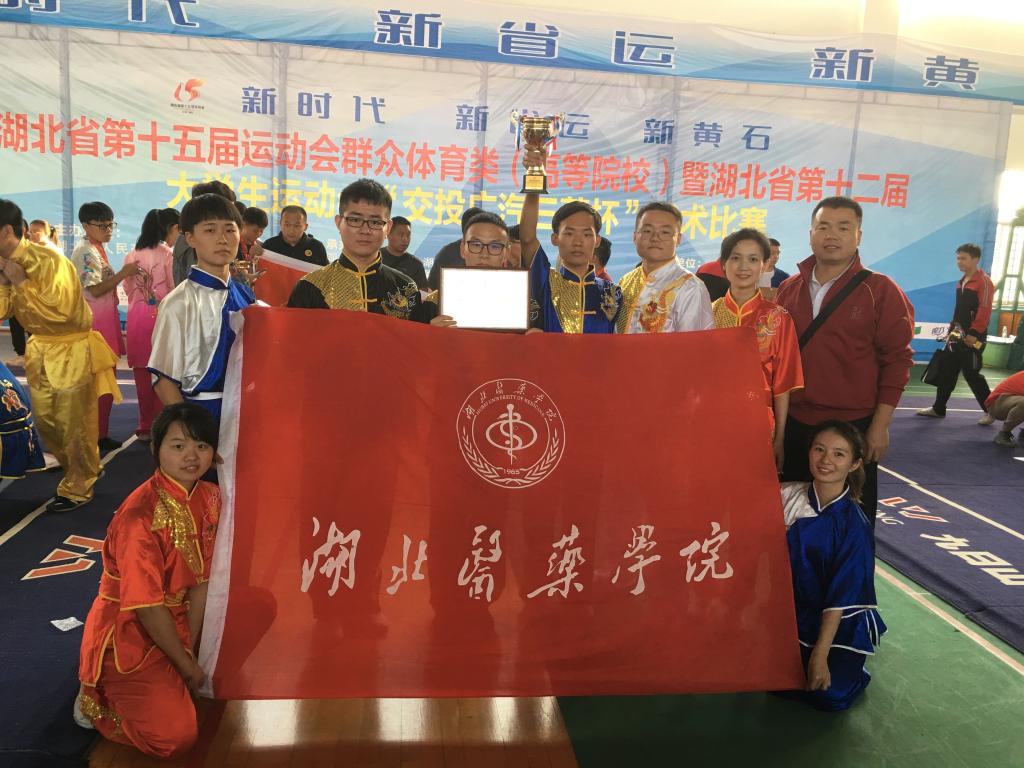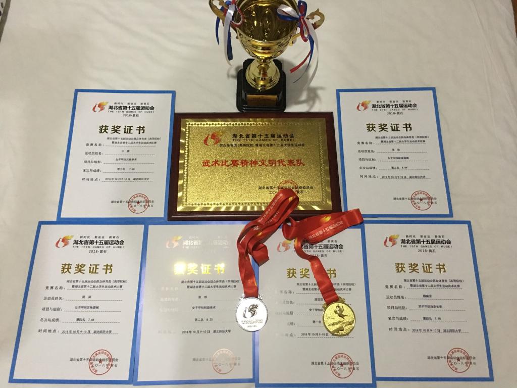 本网讯(通讯员 时保平)湖北省第十五届运动会暨湖北省第十二届大学生运动会武术比赛于2018年10月9日-11日在湖北师范大学举行。我校武术队8名队员在教练员时保平老师的带领下参赛。经过激烈的角逐,斩获一金一银,两个第四名,两个第五名以及女子团体总分第六名的优异成绩。