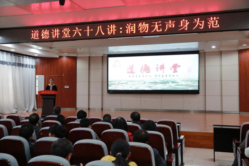 本网讯 (通讯员 安璐璇)12月20日下午,我校第六十八讲道德讲堂在八号楼五楼多功能厅举行。本期道德讲堂由人人操人人摸人人干、人文社会科学学院承办,主题宣讲外语课部教师们的先进事迹。学院分党委书记、院长刘涛、全体无课教师以及心理学系学生参加了活动。