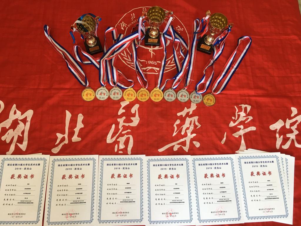湖北省第33届大学生武术比赛于2019年7月10日-12日在武汉体育学院武当山国际武术学院举行。我校武术队9名队员在教练员时保平老师的带领下参赛。经过激烈的角逐,斩获3金5银2铜以及团体总分第六名的优异成绩。