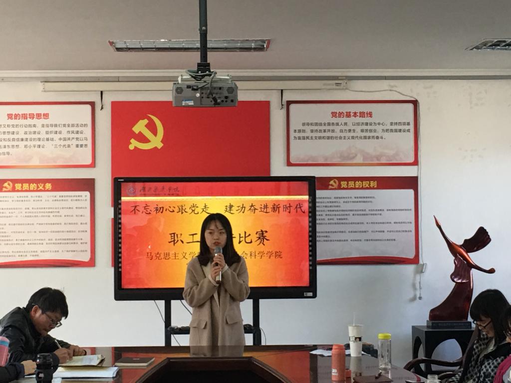 本网讯(通讯员 孙磊)为了深入学习贯彻习近平新时代中国特色社会主义思想,深入开展“不忘初心 牢记使命”主题教育,展示学院教职工爱岗敬业、勇于担当、积极向上的精神风貌,12月5日下午,马院、人文学院“不忘初心跟党走建功奋进新时代”职工演讲比赛在学院四楼会议室举行。经前期各支部初赛推荐,最终8名老师参加学院比赛。