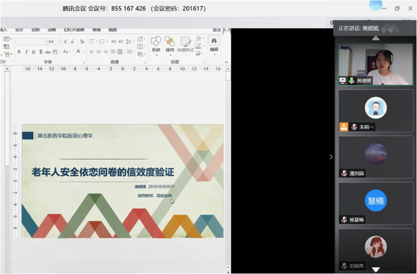 这是人文社会科学学院首届毕业论文答辩会,又时逢新冠肺炎疫情,如何组织好答辩成为一个挑战。为确保本次网络毕业答辩工作的顺利进行,人文社会科学学院和应用心理学系反复测试网络,选定自主学习中心为老师集中地点,确保教师网络的流畅;开通模拟测试会议房间,方便学生测试自己的网络和设备;提前通过APP小程序完成抽签,并告知答辩注意事项,保证答辩过程顺利进行;答辩现场提前开窗通风、提供免洗洗手液、要求评委全程佩戴口罩,并保证1米社交距离,力求答辩全程的安全。