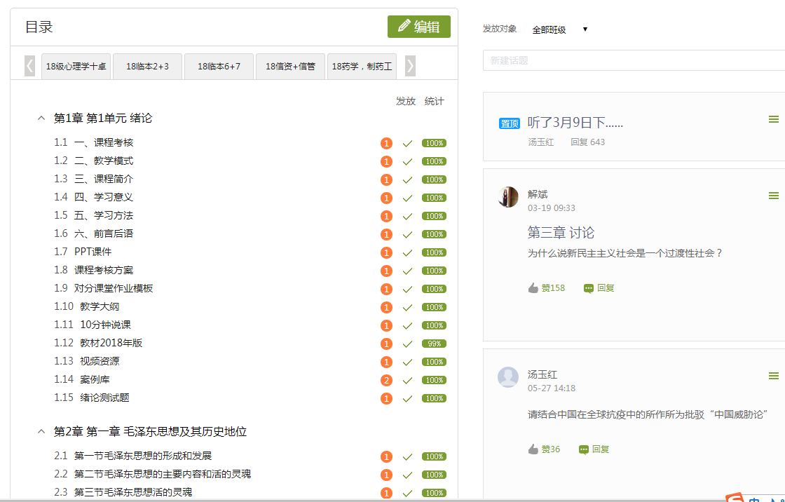一是群策群力,共建共享,打造高水平线上平台。开始线上教学之初,我们就早早谋划,建立“学习通线上课程建设讨论组”,各门课老师集思广益,在超星学习通网络平台上建立了各门课程,大家分工协作,一起共建,资源共享。