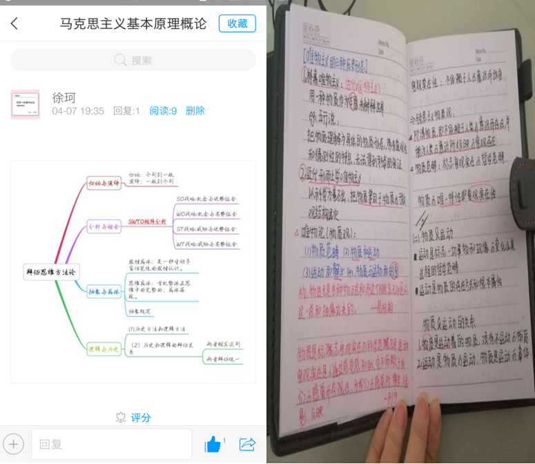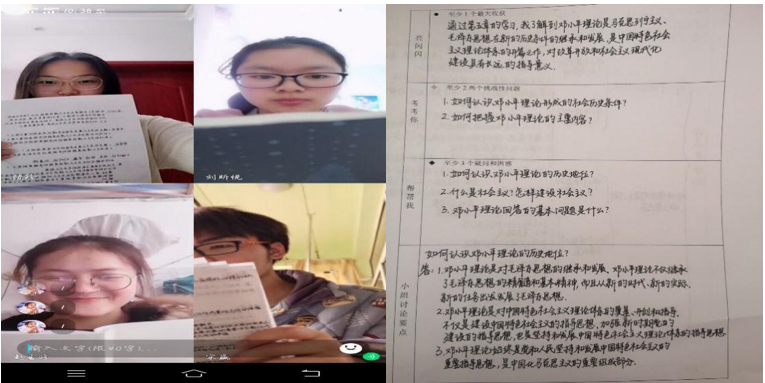 三是师生互动,生生互动,激发学生学习的积极性、主动性和创造性。老师们除了利用QQ、学习通班级群工具与学生进行沟通交流,还结合学生关注点、国内外时事,在讨论区开展讨论,引导学生运用所学理论知识分析实际问题,学以致用。还有老师把学生的优秀作业展示出来,激励学生争先创优。学生的作业如绘制章节思维导图,通过学生互评的方式让学生了解其他同学的学习情况,从而督促自己扬长补短。根据对分课堂教学模式,对学生进行分组,每4名同学1组,要求学生利用微信视频聊天工具进行小组讨论,并将讨论结果填写在对分课堂作业上,视频截图提交到超星学习通课程平台上,取得了生生互动、师生互动的良好效果。