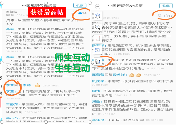 六是总结经验,吸取教训,让思政课成为最受学生欢迎的网络课之一。线上教学期间,根据学生反馈的意见,如学习任务过重、作业过多的情况。老师们精选教学资源,利用分组完成部分作业,在保证教学质量的同时给学生适当减负。解斌老师在接受教育厅督导专家听课时,被给予很高的评价,课部主任昝启均专门安排时间利用腾讯会议让她做了经验交流。李亚老师的《纲要》课取得了生生互动与师生互动活跃的良好成效。学生单帖的跟帖回复最高超100人,学生单帖获赞最高74人;讨论话题单题获赞最高达271人,讨论话题单题回复最多达1279人。网络教学首月问卷数据显示,学生对线上教学的满意度最高达70.3%,获得感最高接近49.5%。课程结束后问卷数据显示,学生的满意度达到98.7%,获得感达到97.5%。通过反馈--调整之后,教学效果明显提升。《形策》课注重教师主导和学生主体相统一,解决思想问题与解决实际困难相结合,做到思想上解惑、心理上解压、生活上解困,提升了教书育人效果。