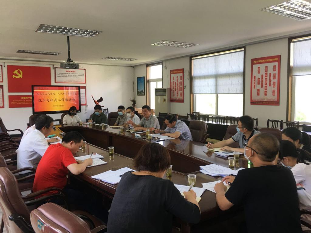 马院、人文学院分党委副书记陈全新首先汇报了学院2020年就业形势和征兵工作的最新进展情况,目前我院毕业生36人,就业率47.2%,其中签约率36.1%,升学率2.8%,灵活就业率8.3%。目前已动员8名学生参加征兵体检。