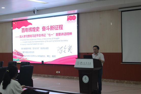 陈全新院长以《百年辉煌史,奋斗新征程——深入学习贯彻习近平“七一”重要讲话精神》为题,从学习目的和意义、主要框架和内容、学习方法和要求等方面,详细解读习近平总书记七一讲话的精神内涵,梳理了中国共产党百年辉煌史及进入新世纪我国各领域取得的辉煌成绩,全面回顾党的奋斗历程、伟大成就、基本经验,带领师生沉浸于百年奋斗的恢弘史诗,深刻感悟共产党人的初心和使命。