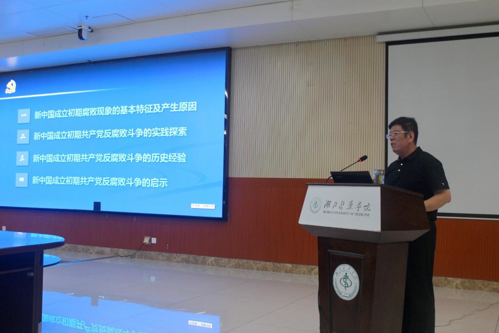 赵鹏飞书记以《以史为鉴,增强全面从严治党永远在路上的政治自觉》为主题,从习近平总书记“七一”讲话中14个“第一次”新提法,引出中国共产党在百年奋斗历程中形成的伟大建党精神,结合建国初期我党为推进党的建设所进行的反腐案例,通过对“新中国成立初期腐败现象的基本特征及产生原因”、“新中国成立初期反腐败斗争的实践探索”、“新中国成立初期反腐败斗争的历史经验”及“新中国成立初期反腐败斗争的有关启示”等四个方面的讲解,系统全面地剖析了新中国成立初期的反腐败斗争及其历史经验。