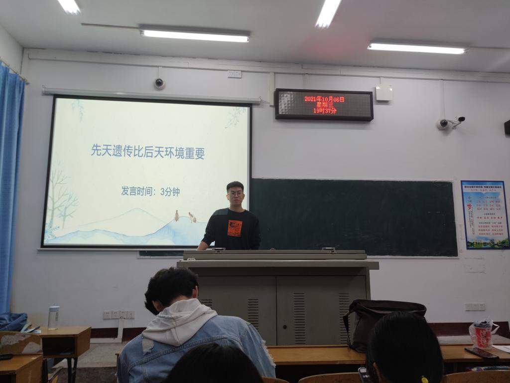 辩论赛开始,正方辩手首先依次上台进行三分钟的自我展示,万家骏等同学从生物学的遗传、好的基因成就人才以及先天决定你是什么等角度展开论述,紧扣先天遗传比后天环境重要的论题,深入浅出地证明自己的观点,表达从容大方,展示了时代青年的良好风采。