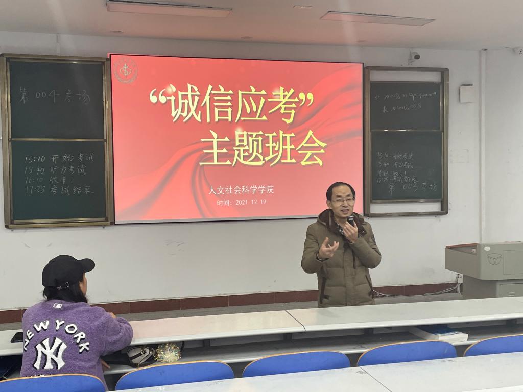 本网讯(通讯员魏士宇)12月19日晚六点,为顺利迎接考试周到来,人文社会科学学院于5212教室开展“诚信应考”主题班会。参会人员有学院分党委书记赵万红,学工处处长陈璞和各班级辅导员及我院19、20、21级所有学生。
