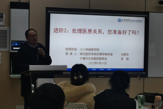 本网讯(通讯员 魏晨)3月24日上午第四五节课,2019级卓越医师班40名同学的《医学伦理学》见面课堂“进阶2:处理医患关系,您准备好了吗”正在有序开展,任课教师马菊华邀请附属太和医院医务处李瑞副主任为同学们主讲。教学团队年轻老师现场听课。