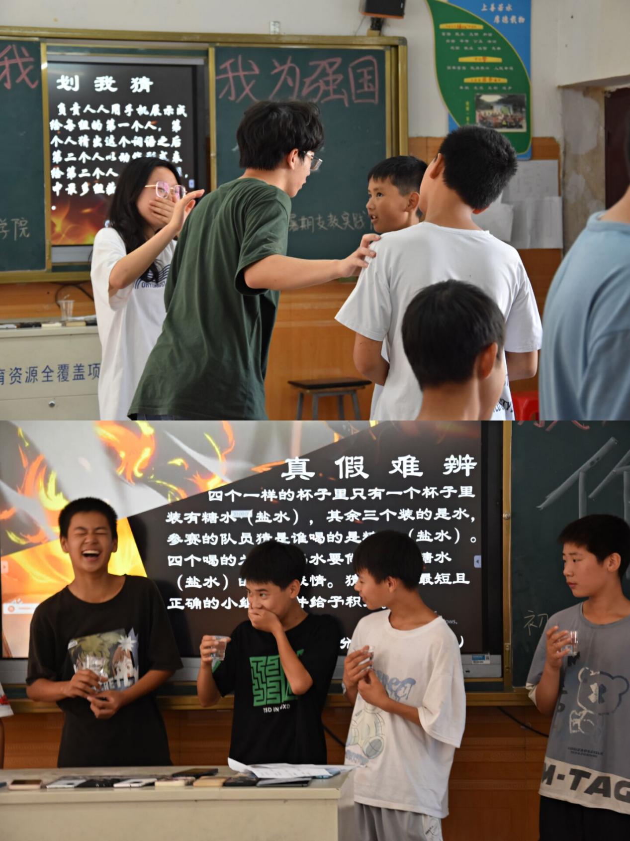 是曰“上下同欲者胜”,当个人遭遇困难,难以独立克服时,寻求他人协助共同应对不失为良好的解决方案。经过三天关于信任和自信的团辅,孩子们彼此熟悉且更愿意表达自己,此为开展团结主题活动提供了契机。活动伊始,实践队成员柳艾带领大家进行了“花开花落”热身小游戏,气氛迅速活跃,孩子们投入其中。在欢快的情绪下,大家迅速开展了第二项“真假难辨”小游戏,孩子们乐在其中,用滑稽的表演博得大家的笑容。