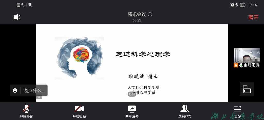 9月14日上午,人文学院分党委书记赵万红运用腾讯会议给新生们做了校史校情和文明城市创建专题教育讲座。赵书记绘声绘色地给同学们讲了十堰市和学校的发展历程,还给同学们分享了应用心理学专业的就业前景,最后提出期望和要求,希望同学们志向高远、厚德善行,勤勉好学、追求真知,勇于实践、回报社会。