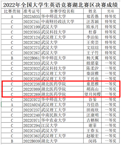 本网讯(通讯员 李君君)近日,2022全国大学生英语竞赛(National English Contest for College Students)湖北赛区决赛成绩揭晓,我校3名学子喜获非英语专业本科组一等奖,其中童思雅同学晋级全国总决赛。