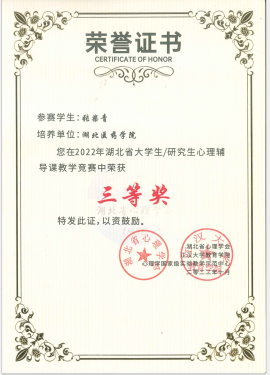 本网讯(通讯员 柴晓运)近日,人文社会科学学院应用心理学系收到湖北省大学生/研究生中小学心理健康课教学大赛组委会寄来的证书,我校选拔的2020级欧阳瑞婷、张宇琪和张柴青等三位同学均喜获三等奖。