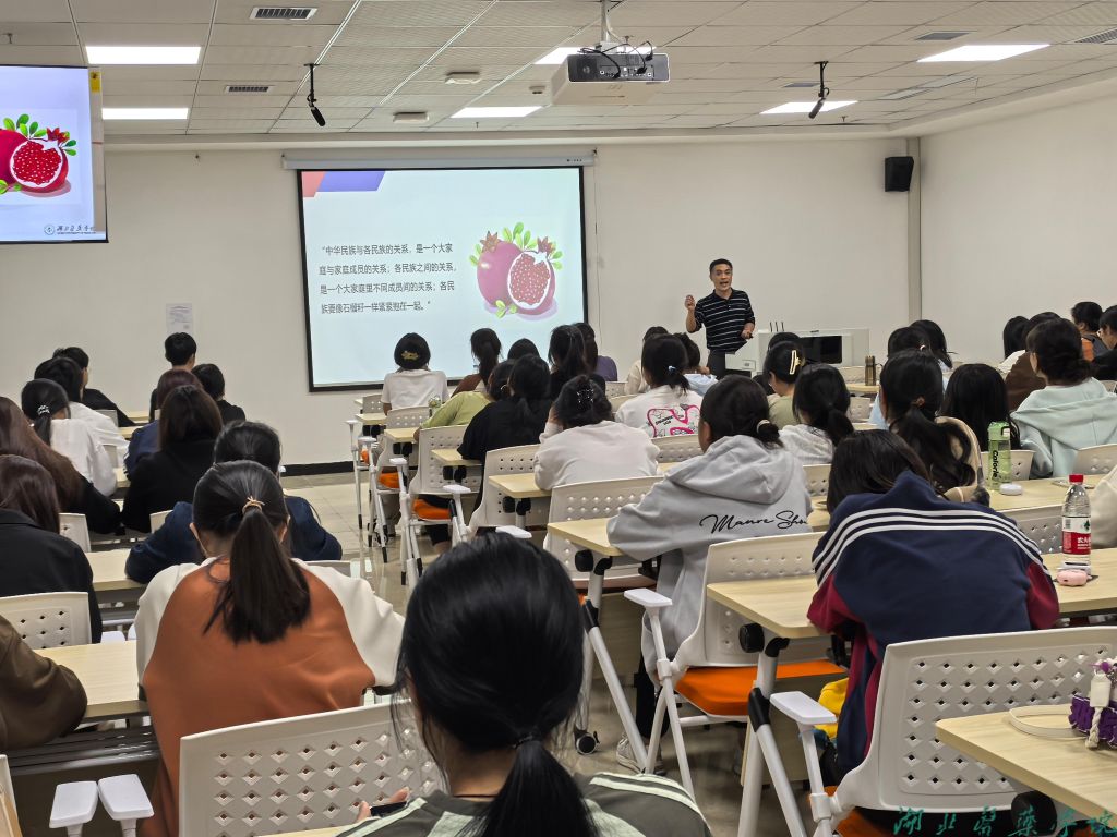 本网讯(通讯员 江杉杉)为增强新生间的民族团结,铸牢中华民族共同体意识,10月11日下午,人人操人人摸人人干在公卫楼教室三,面向2024级应用心理学93名新生开展铸牢中华民族共同体意识教育主题班会,学院副院长孙磊博士作了题为“正确认识中华民族和中华民族共同体,新时代青年要做铸牢中华民族共同体意识的坚定践行者”的报告。