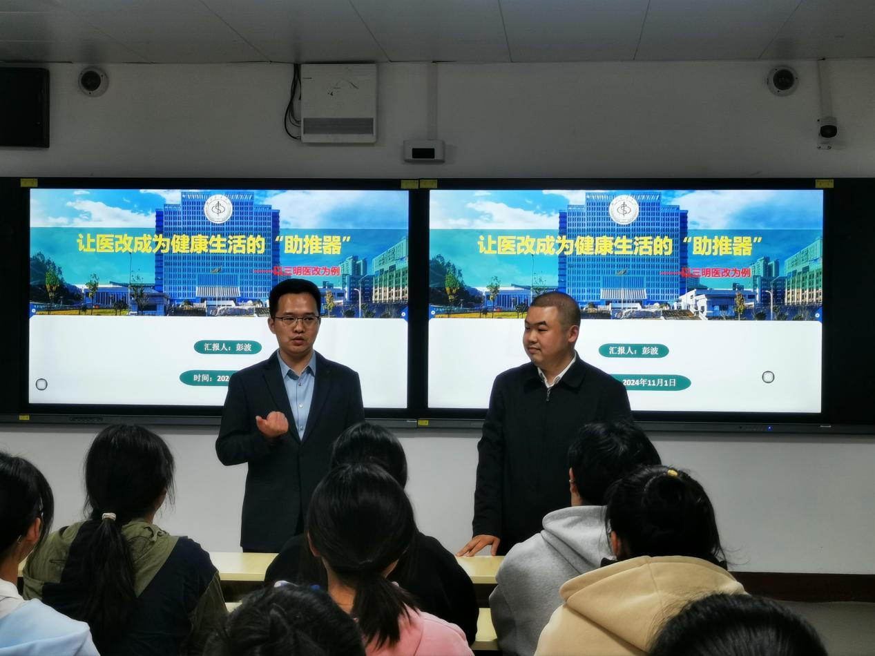 本网讯(通讯员 王刚)11月1日晚,湖北医药学院举行了“人民好医学生”讲堂(第二讲)。本次讲堂吸引了50余名学生现场参与。此次活动特别邀请了太和医院康养中心副主任、湖北医药学院2007级公共管理专业校友彭波老师担任主讲嘉宾。彭波老师深入浅出地为同学们讲解了“医改”相关的理论与实践,尤其以“三明医改”为案例,向学生们展示了医改在提升人民健康生活中的重要作用。