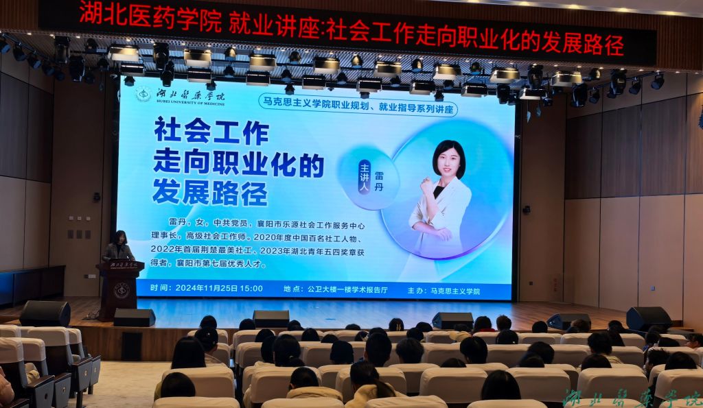 雷丹是2020年度中国百名社工人物、2022年首届荆楚最美社工、2023年湖北青年五四奖章获得者,襄阳市第七届优秀人才。她做题为《社会工作走向职业化的发展路径》的讲座,结合自身的职业经历详细地向学生们介绍社会工作者这一职业,以及社工在社区基层治理、未成年人保护、司法领域所开展的服务与实践。如社区矛盾调解,建设和谐邻里关系,社区共同缔造等,对未成年人开展家庭、学校、社会多个层面的支持和帮助,推动建立未成年人保护网络等,司法领域开展犯罪预防教育、社区矫正、心理安慰和援助等工作。