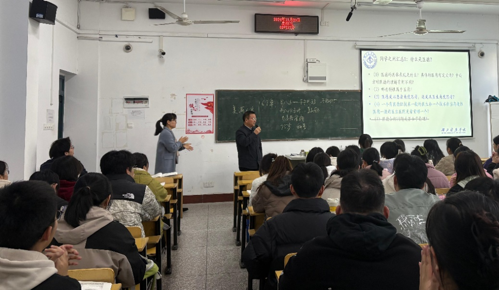本网讯(通讯员 魏晨)在本学期《医学伦理学》课程的尾声,22级临床医学5班、2022级儿科学1班的课堂迎来了别开生面的教学创新体验:讲台上并肩站立着两位教师,共同演绎 “双师协同”教学模式,为课程画上了独特的句号。