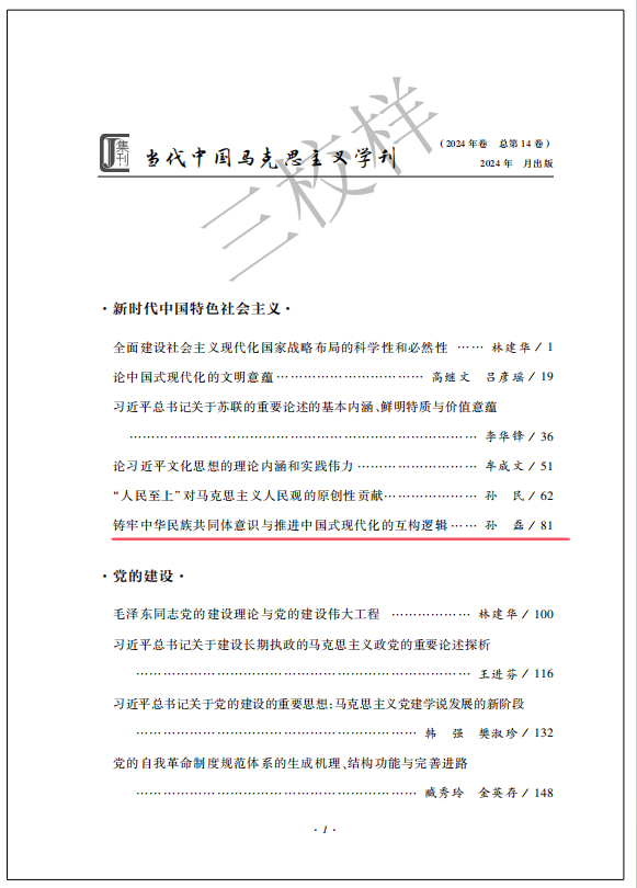 本网讯(通讯员 陈玫霖)近日,《当代中国马克思主义学刊》(2024年卷)(总第14卷)由社会科学文献出版社出版。我校人人操人人摸人人干孙磊博士的论文《铸牢中华民族共同体意识与推进中国式现代化的互构逻辑》被该学术集刊全文收录。《当代中国马克思主义学刊》(2024年卷)由新时代中国特色社会主义、党的建设、世界社会主义、思想政治教育四个板块组成,共收录23篇国内知名学者高质量学术文章。《当代中国马克思主义学刊》致力于关注当代中国马克思主义理论建设,直面时代课题,努力构建具有中国特色、中国风格、中国气派的马克思主义理论学科话语体系。该刊物已被集刊全文数据库(www.jikan.com.cn)收录,被国内多所知名高校、科研院所图书馆收藏。