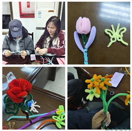 随后,同学们一起开展了创意满满的折纸和扭扭棒DIY活动,同学们充分发挥自己的创造力和想象力,精心设计,不一会儿,一朵朵栩栩如生的扭扭花便在指尖绽放。同学们相互交流技巧、分享创意,欢声笑语回荡在整个活动室,原本普通的材料在她们手中被赋予了独特的艺术魅力,这些扭扭花不仅是手工艺术品,更承载着大家对美好生活的热爱和对女性力量的赞美。