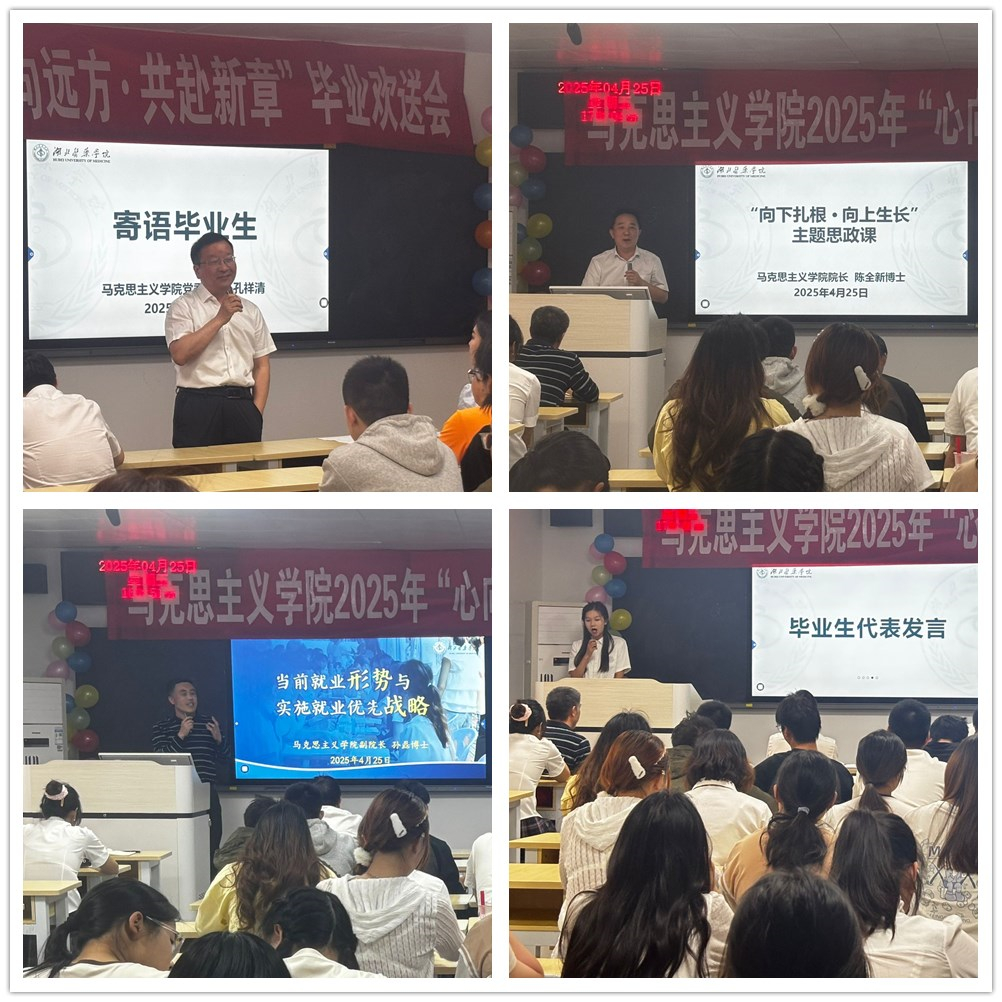 学院副院长孙磊就当前就业形势进行了全面且深入的解读。他从当前社会经济形势出发,分析了就业市场的现状与趋势,为毕业生们提供了实用的就业指导和建议,鼓励大家积极应对就业挑战,把握机会,勇敢迈向职场。学院院长陈全新带来“向下扎根•向上生长”主题思政课,他结合马克思主义理论与现实生活,激励毕业生在未来的人生道路上坚守初心、砥砺奋进,既要脚踏实地、沉稳积累,又要积极进取、不断向上。随后,党委书记孔祥清饱含深情地寄语毕业生,表达了学院对同学们的殷切期望和深深祝福,希望大家在离开校园后,秉持积极向上的人生态度,努力在各自领域发光发热,为社会发展贡献力量。