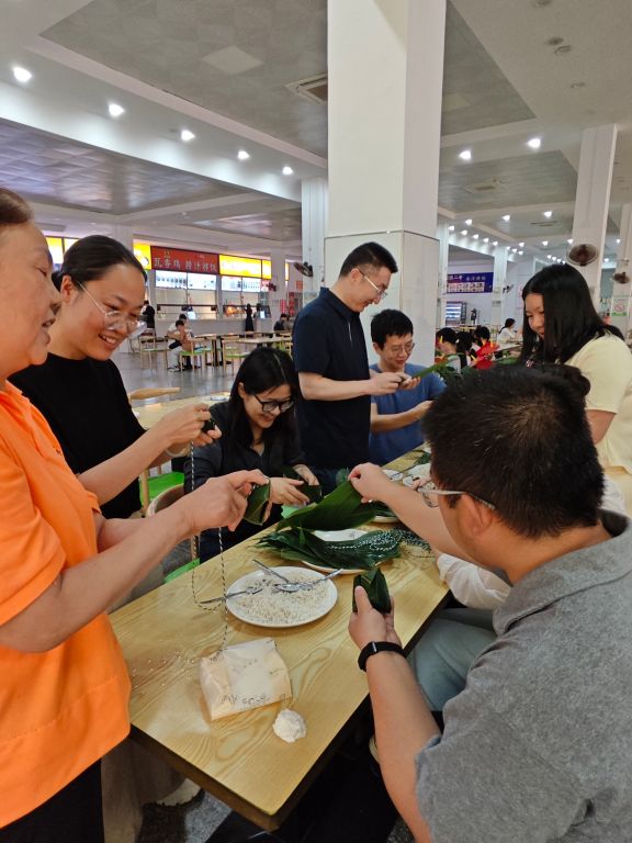活动伊始,几位包粽子经验丰富的老师和同学主动担任“老师”,向大家耐心传授包粽子的技巧。他们一边示范,一边讲解:“先把粽叶卷成漏斗状,然后放糯米,再加入馅料,最后用绳子绑紧。”大家围在“老师”身边,认真观察每一个步骤,随后纷纷动手尝试。尽管大家的手法还略显生疏,包出的粽子也是形态各异,有的小巧玲珑,有的“体态丰腴”,但大家热情高涨,互相交流经验,互相帮助,现场气氛热烈而温馨。