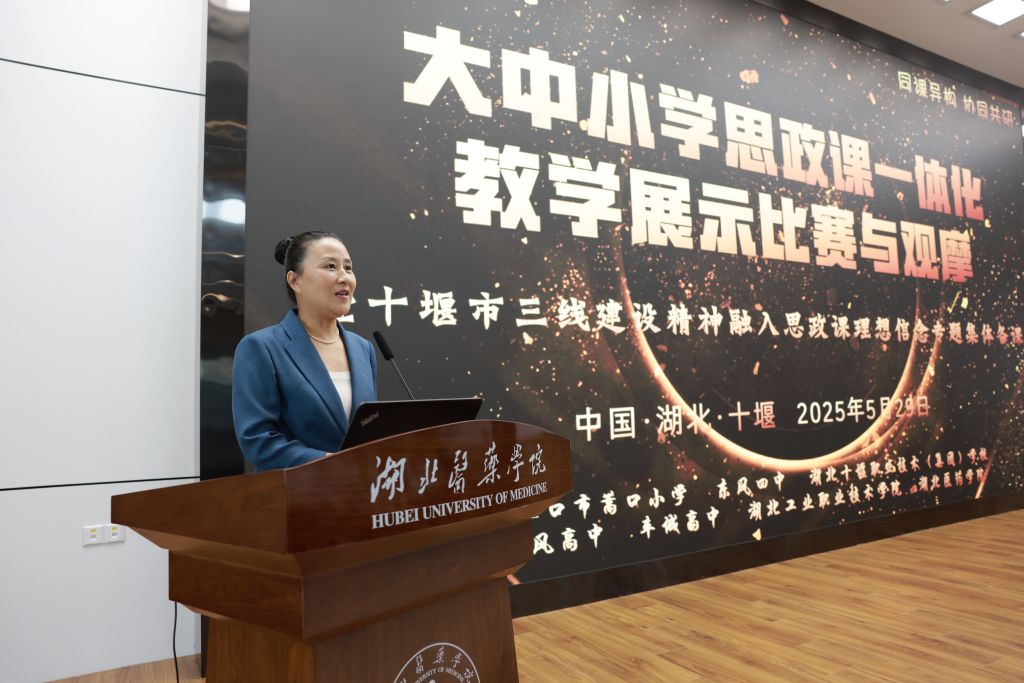 谭艳在致辞中指出,大中小学思政教育一体化建设是落实"为党育人、为国育才"教育大计的关键举措。各成员单位始终坚持把立德树人作为根本任务,精准把握一体化建设中目标导向、问题导向、效果导向的辩证关系,通过加强顶层设计构建科学思政课程体系,切实提升思政课一体化教学的使命担当,实现全员育人、全程育人、全方位育人。本次教学展示活动创新性地将十堰市三线建设精神融入课程设计,提供了一个让各学段思政教师同台竞技、互相交流、互相融合的平台,期待参赛教师展现高水平教学能力。同时,作为十堰市大中小学思政课一体化共同体牵头单位,湖北医药学院将充分发挥学科、师资和课程建设优势,着力打造具有区域特色的思政课一体化建设样板。