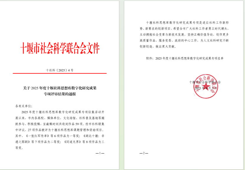 此次获奖作品以鲜活的视听语言解构城市发展脉络、感悟三线精神及城市IP形象的视觉传达,将学术思考转化为大众可感的传播内容,既是马院社科普及工作数字化转型的缩影,也为全市社科普及事业的创新发展提供了实践样本。未来,十堰市社科联将持续赋能该类社科成果转化,推动区域人文社科研究与时代需求深度耦合。(审核 陈全新)
