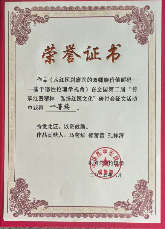 本网讯(通讯员肖飞)6月28日至29日,由《中国医学伦理学》杂志主办、哈尔滨医科大学承办的第二届“传承红医精神 弘扬红医文化”研讨会在哈尔滨医科大学成功召开。本次研讨会聚焦红医精神的深刻内涵与时代价值,旨在推动红医文化资源的整合以及红医育人体系的构建,吸引了众多专家学者与研究生参与。经过三轮论文盲评,我院马菊华、邵蕾蕾、孔祥清三名老师合作的《从红医到廉医的双螺旋价值解码——基于德性伦理学视角》获得一等奖、陈俊泽、马菊华老师的《红医精神的哲学反思:从本体、认知到实践》获得二等奖的好成绩,马菊华老师受邀作主旨报告。