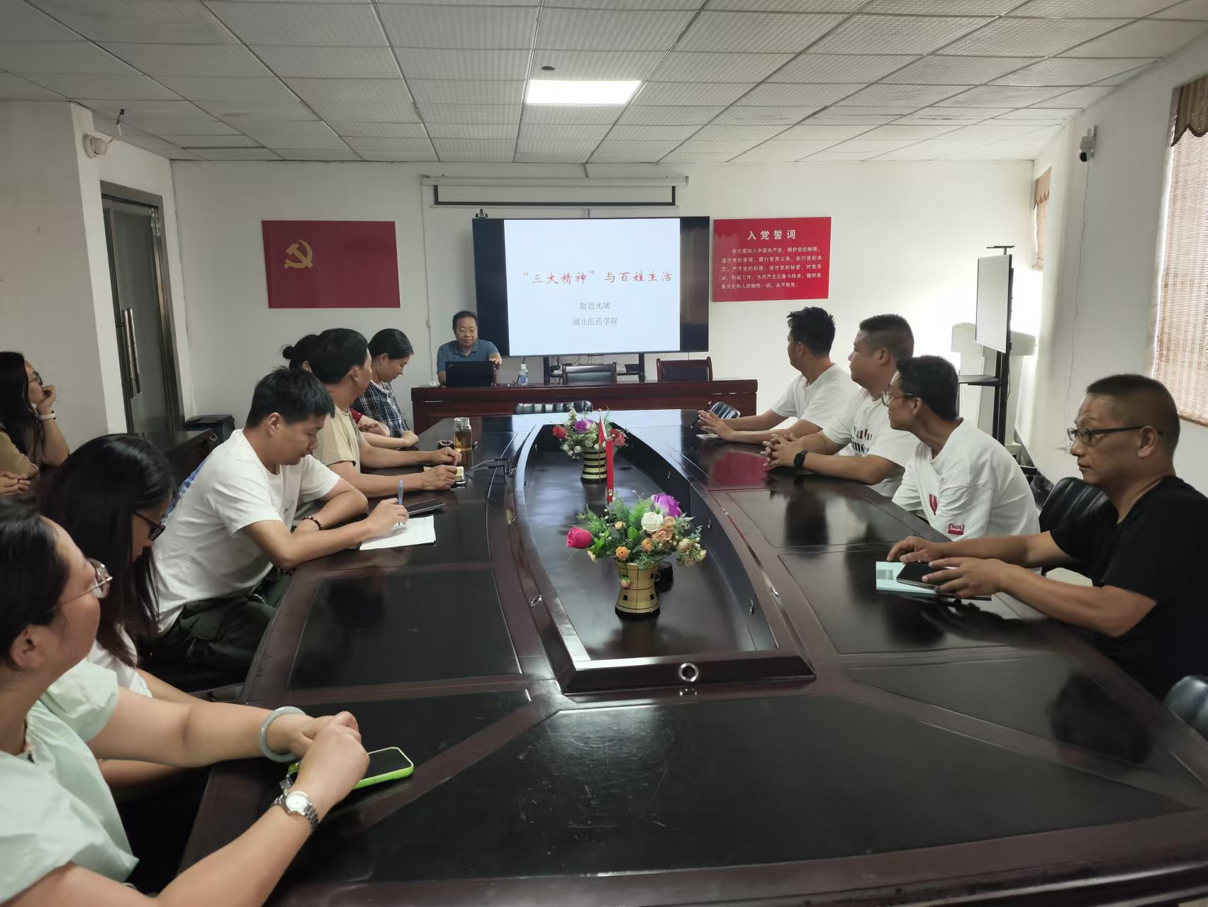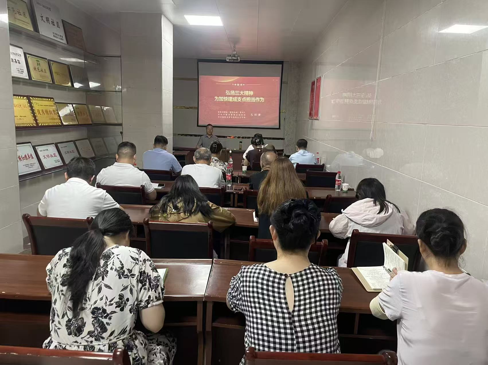 9月26日上午,孔祥清教授以《大力弘扬三大精神,落实省市全会部署,为建成支点贡献基层力量》为题,在十堰市茅箭区上海路吉祥社区,与二堰街办机关干部、吉祥社区干部、商圈业主近50名党员同志们交流。孔祥清教授分别从“牢记殷殷嘱托,勇担使命任务”“弘扬三大精神,汇聚支点力量”“贯彻全会精神,投身支点建设”三个部分,就深入学习习近平总书记考察湖北重要讲话精神,深刻领会三大精神的丰富内涵与时代价值,贯彻落实省委市委全会支点建设工作部署,与党员同志们进行交流,号召街道社区的党员干部要在基层带头为支点建设贡献力量。
