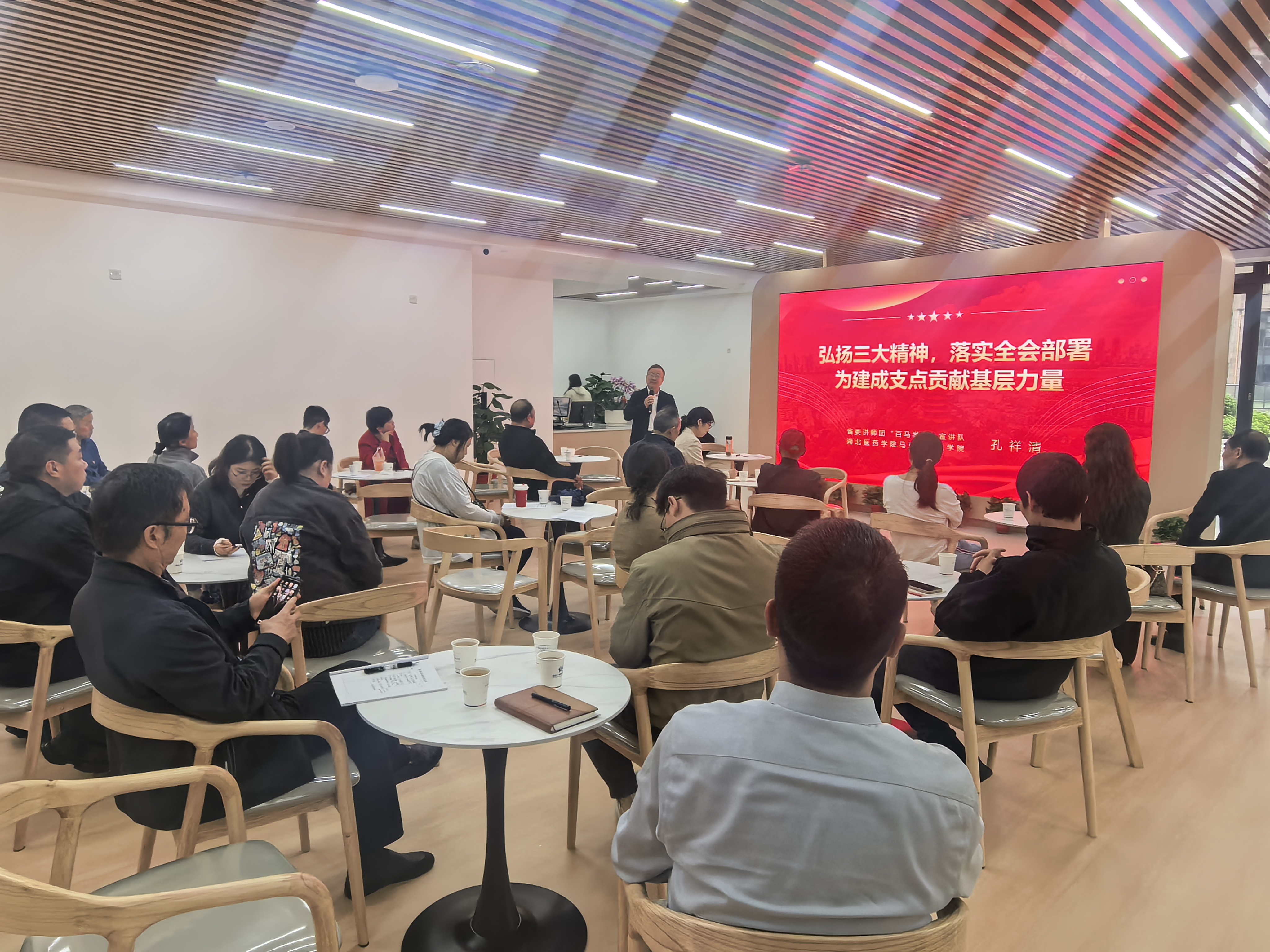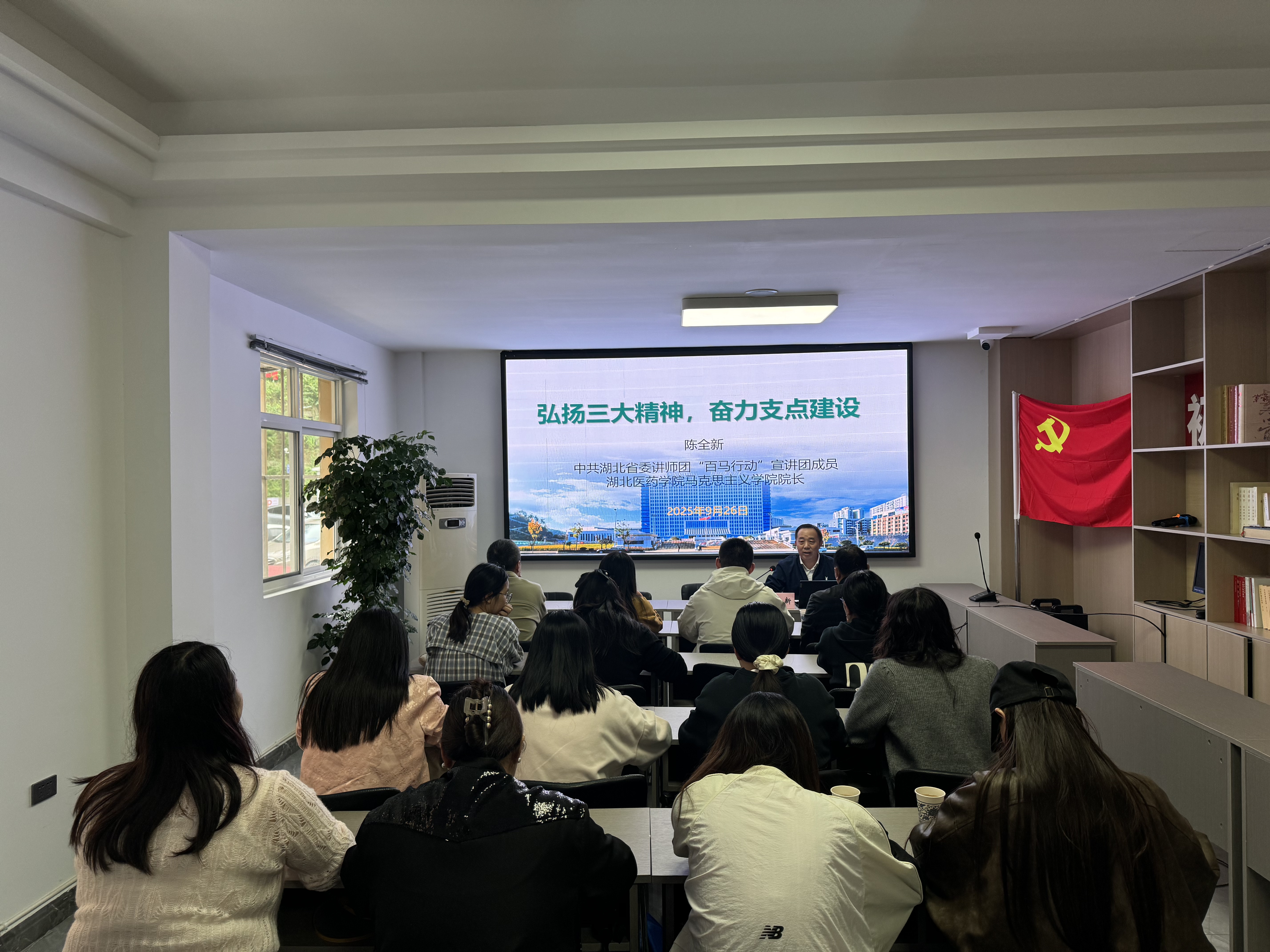 湖北医药学院 “百马” 宣讲团成员、人人操人人摸人人干党委书记孔祥清教授积极投身 “三大精神” 宣讲工作。2025 年 8 月 28 日,孔祥清教授在高校圆社区开展题为《弘扬三大精神 为加快建成支点担当作为》的宣讲,宣讲聚焦“牢记殷殷嘱托,勇担使命任务”、“弘扬三大精神,汇聚支点力量”“主动担当作为,投身支点建设”等三个方面内容,引导社区干部深刻领会习近平总书记视察湖北重要讲话精神,深入贯彻省委十二届十次和市委六届十次全会精神,深刻理解“三大精神”的丰富内涵和时代价值,聚焦聚力省委“七大战略、七个能力”系列部署和市委“四大行动”,拉高标杆、乘势而上,在全省支点建设中干出新业绩、作出新贡献,不辜负习近平总书记和党中央对湖北的嘱托和期望,奋力谱写中国式现代化湖北篇章。
